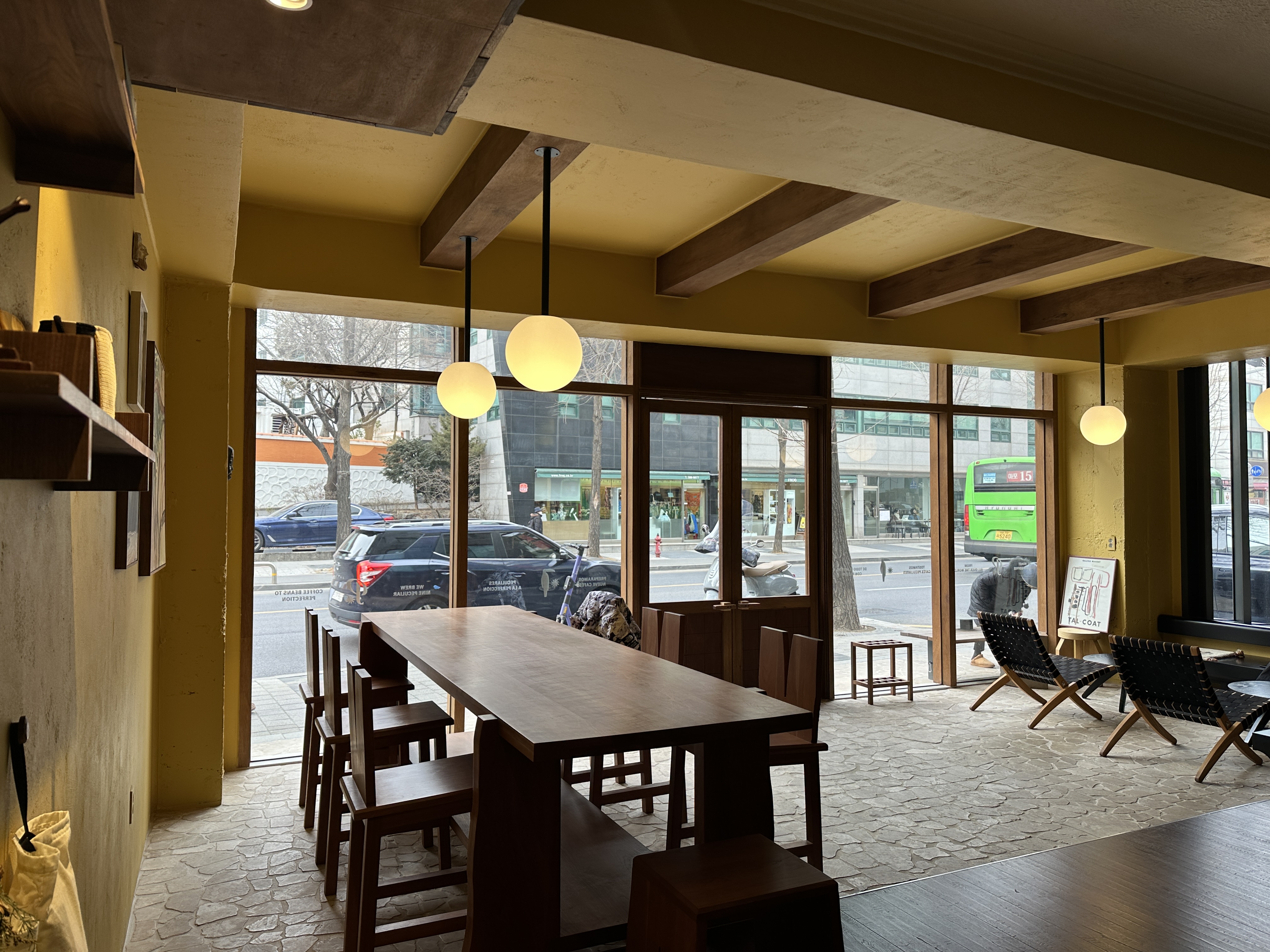 - 인테리어 특징: 짙은 월넛 톤의 우드 가구와 화이트 벽면의 조화가 굉장히 고급스럽습니다. 특히 이곳의 시그니처라고 할 수 있는 통창을 통해 들어오는 채광이 일품이에요. 해가 지는 오후 시간에 방문하면 매장 안으로 길게 드리워지는 빛줄기가 마치 영화의 한 장면 같습니다.