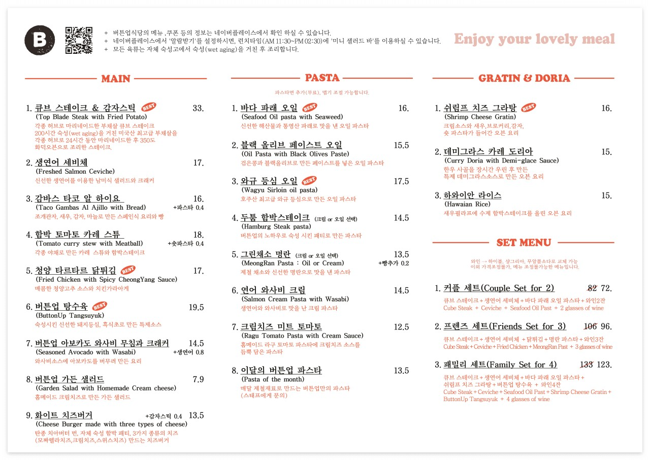보통 파스타 전문점은 파스타만, 중식당은 중식만 잘하기 마련인데 버튼업은 경계를 허무는 맛을 보여줍니다. 퓨전 레스토랑으로 다양한 메뉴를 즐길 수 있고 어떤걸 시켜도 다 맛있습니다. 그래서 갈때마다 고민이 된다지요.