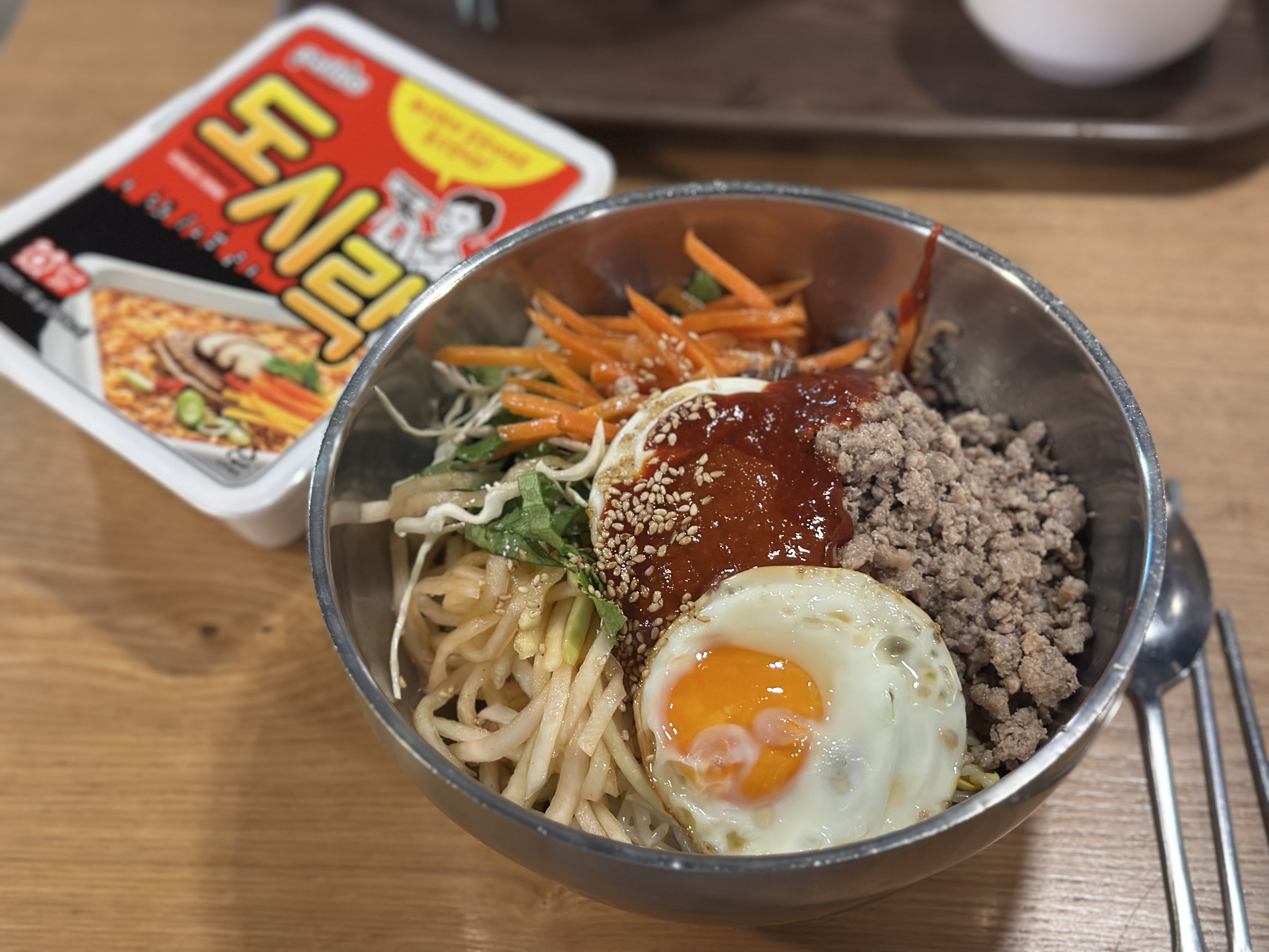 비비리 2가 다른 비빔밥집과 차별화되는 가장 놀라운 점은 바로 작은 컵라면이 무료로 제공된다는 점입니다. 비빔밥을 먹다 보면 따끈한 국물이 생각나기 마련인데, 매장 한쪽에 마련된 컵라면 코너에서 원하는 라면을 골라 뜨거운 물을 부어 먹을 수 있습니다. 비빔밥과 컵라면의 조합은 한국인이라면 누구나 좋아할 수밖에 없는 '꿀조합'입니다.