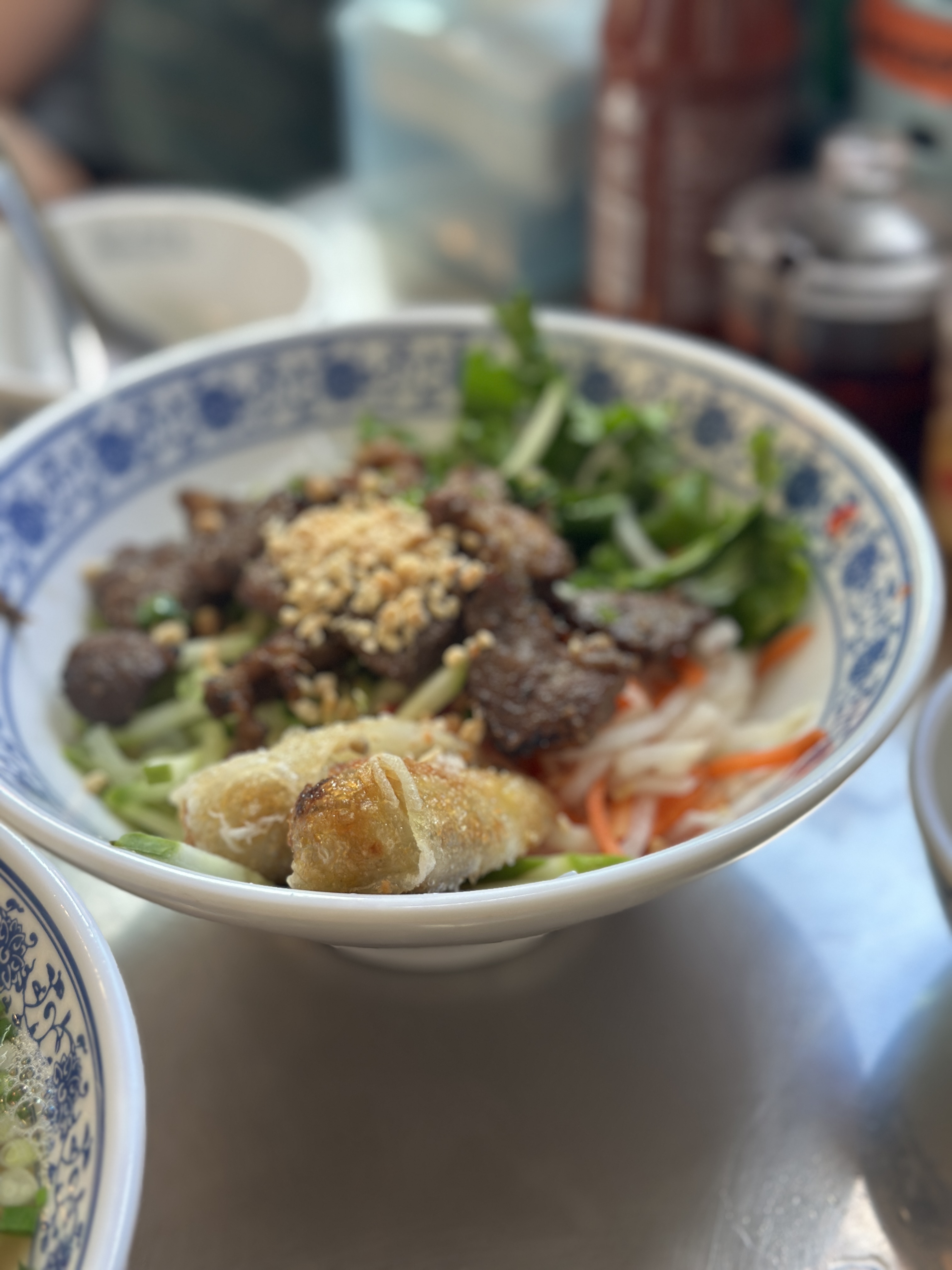 더운 날씨나 상큼한 게 당길 때 최고의 선택입니다. 숯불 향 가득한 돼지고기와 신선한 채소, 그리고 새콤달콤한 느억맘 소스가 어우러져 입맛을 확 살려줍니다. 짜조(튀김 만두)가 함께 올라가 식감까지 완벽해요.
