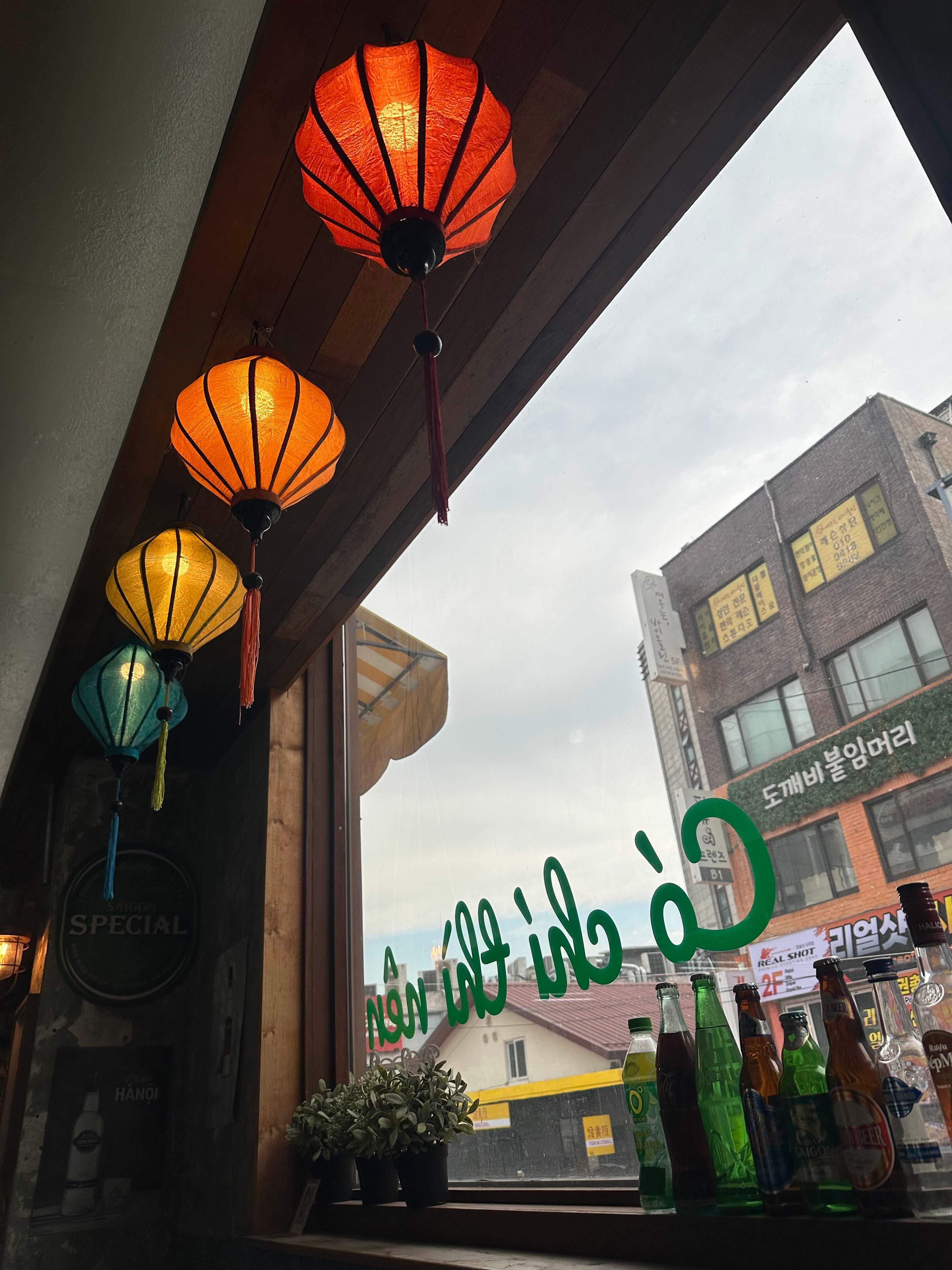 - 압도적인 비주얼: 멀리서도 한눈에 들어오는 쨍한 간판은 이미 홍대역의 랜드마크가 되었습니다. 베트남 현지 식당을 그대로 옮겨 놓은 듯한 인테리어 덕분에 입구부터 '인생샷' 포인트가 가득해요.