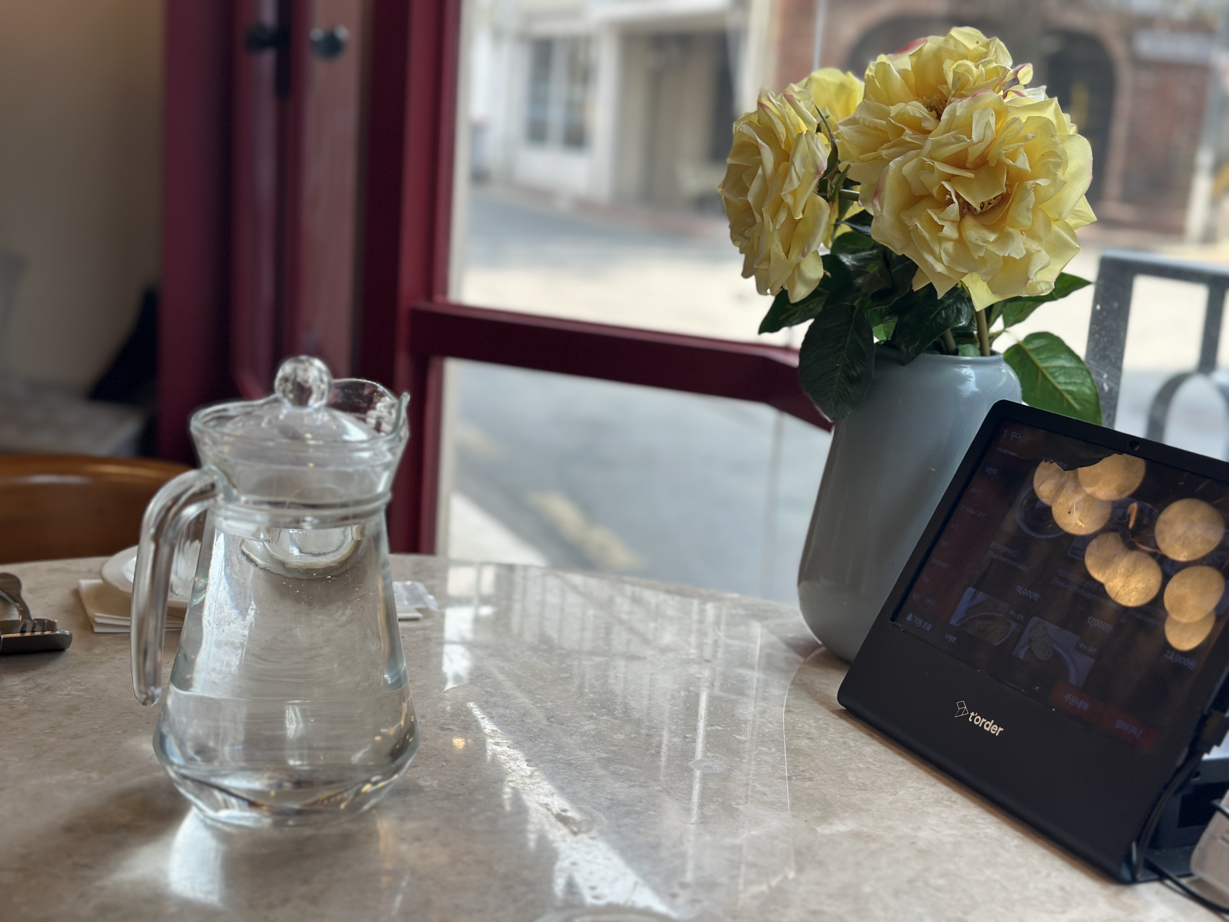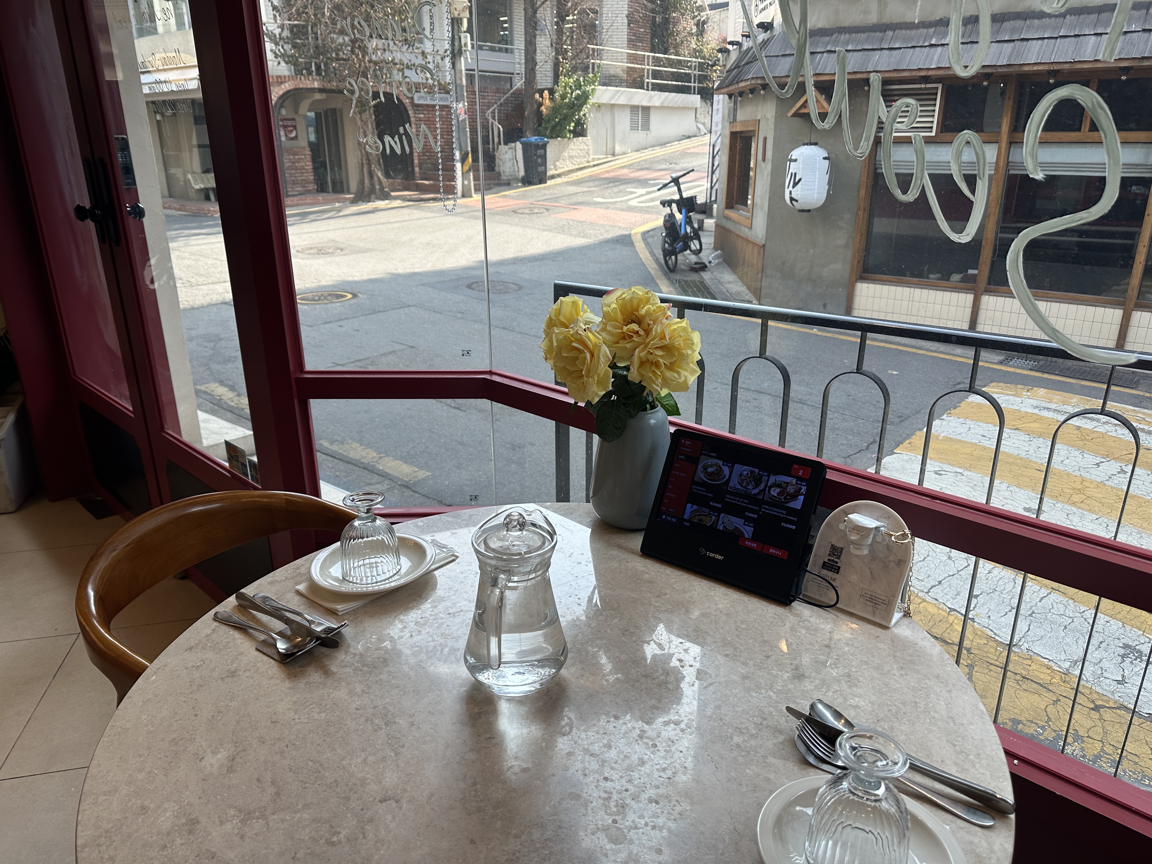 오랜만에 친구와 약속을 잡았는데 중간지점이 강남역이라 (갈아타지 않고 한번에 갈 수 있는 중간 지점) 근처 맛집을 찾았어요. 지난번에 갔던 곳도 괜찮았지만 여기는 너무 마음에 들었답니다. 후기를 찾아보니 맛도 좋고 분위기도 좋다가 대부분이었는데 정말이었어요! 2층은 예약이 거의 되어있어 가운데 자리만 있다고 알려주셔서 1층 창가에 앉았답니다.