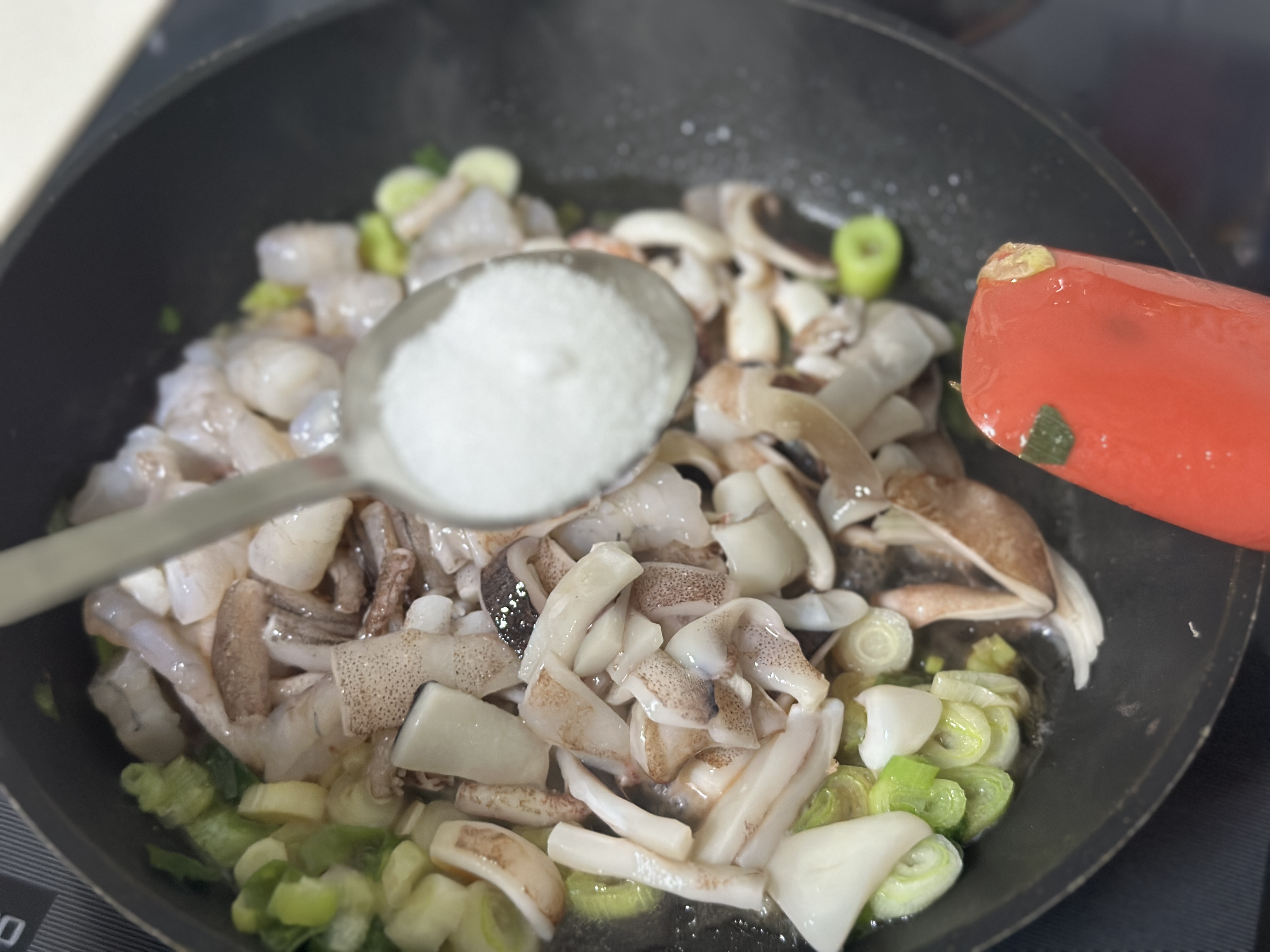 2. 파기름이 나오면 오징어를 넣고 동시에 설탕을 한 스푼 넣어 볶는다.
