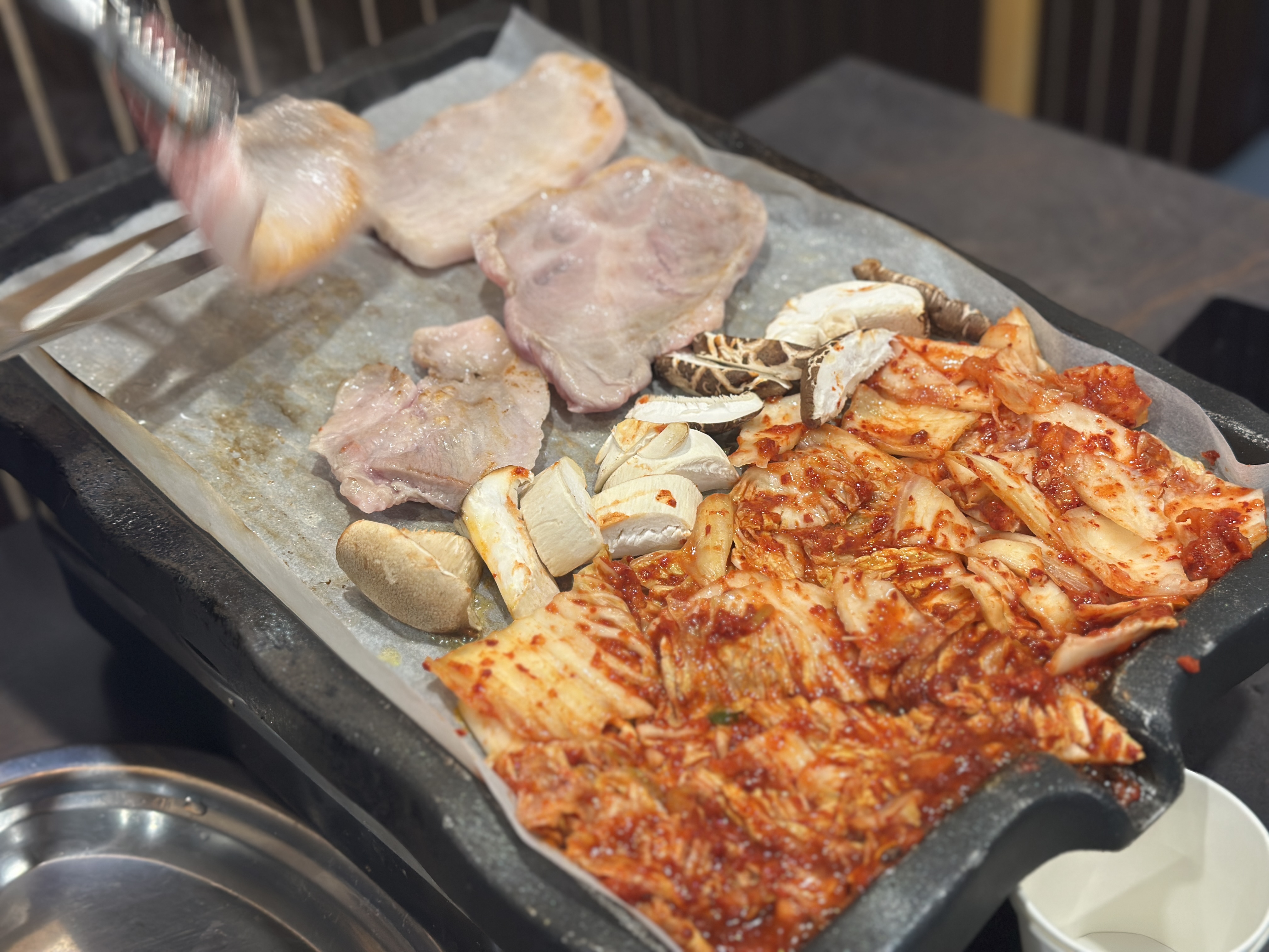 마포역 근처에서 수업을 듣고 근처 맛집을 찾는데 꽤 먹을 곳이 많아 고르기가 쉽지 않았다.그러다 발길을 잡는 문구 점심 특선 17,000원! (삼겹살, 미나리, 김치, 버섯, 솥밥에 찌개까지!) 1시 반이 다 되어가는 시간이라 한산한 매장에서 배부르게 식사를 할 수 있었다. (우리 말고 두 테이블 정도 더 식사 중) 오겹살, 삼겹살, 목살 중 고를 수 있어서 삼겹살, 목살 픽! 직접 고기를 구워주셔서 맛있게 먹을 수 있었고 미나리, 김치, 버섯 등을 같이 구웠는데 크흐. 한번에 먹으니 그렇게 맛있을 수가 없다. 계란찜과 찌개도 만족! 계란찜은 영수증 리뷰 이벤트로 서비스!
